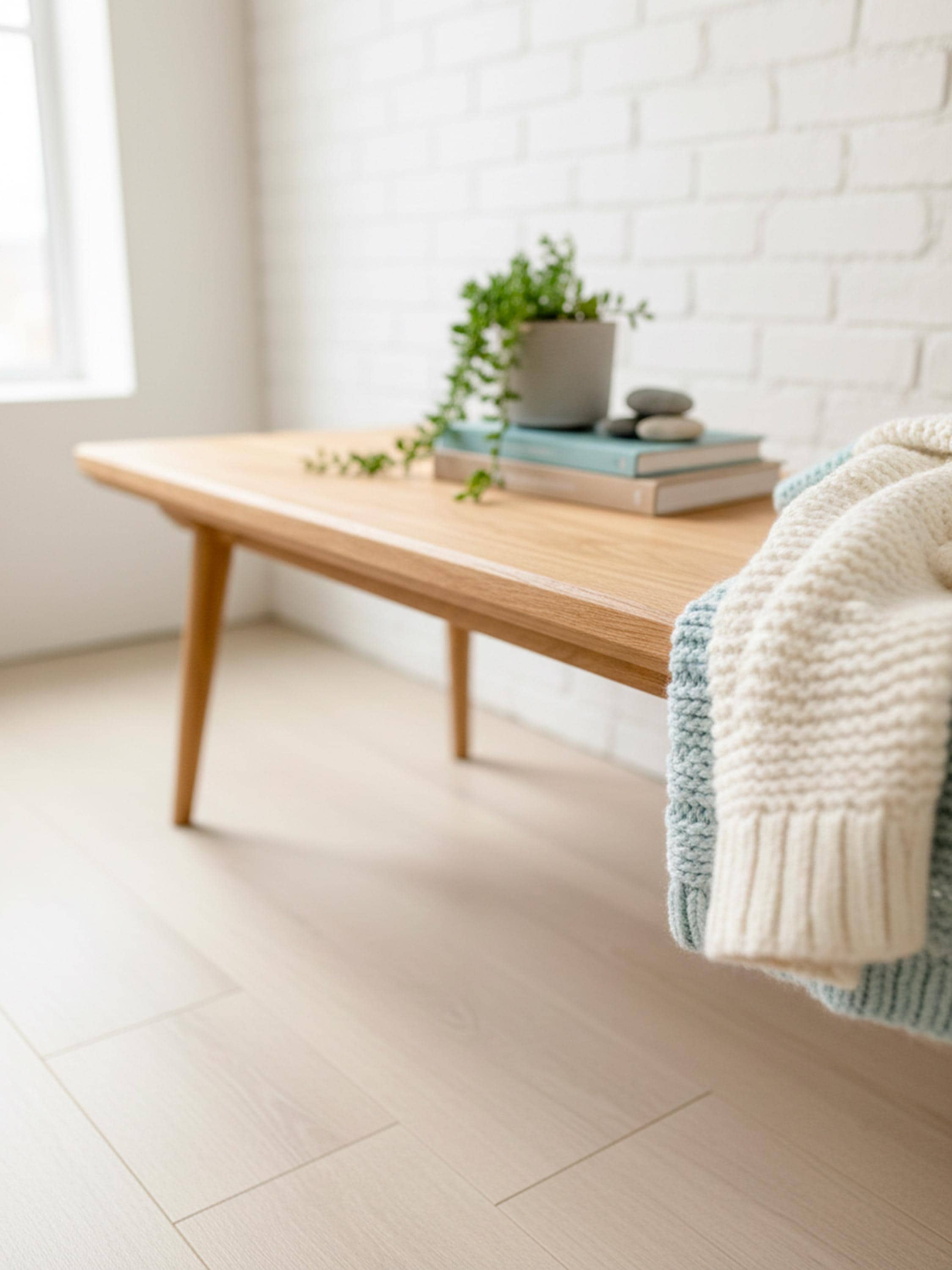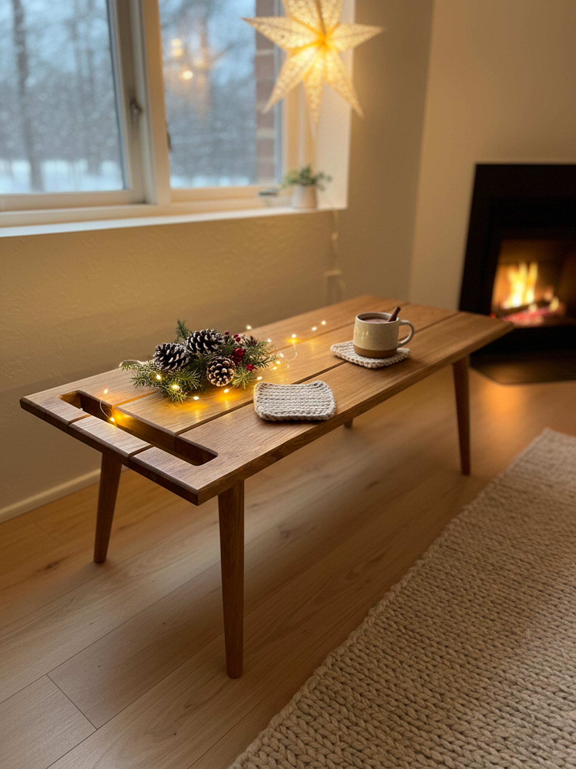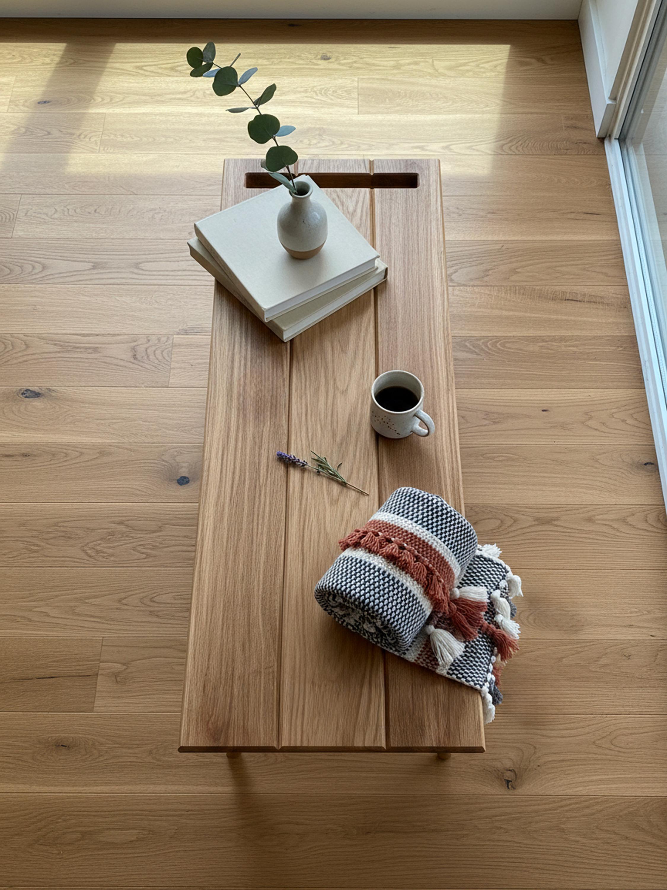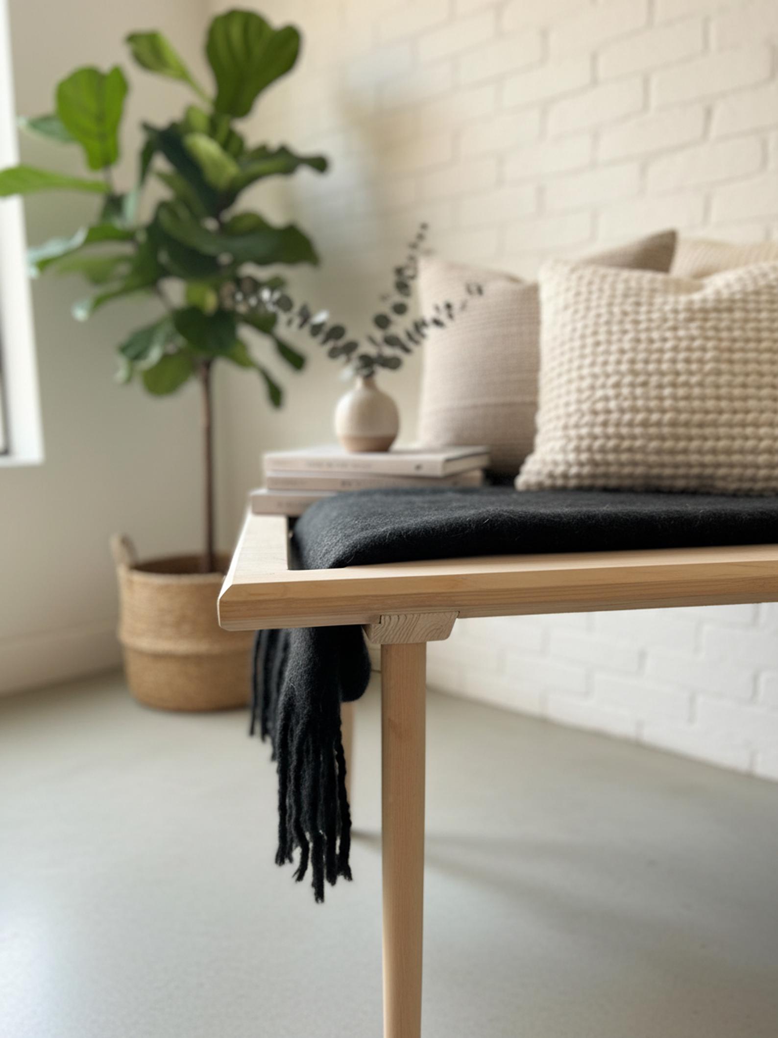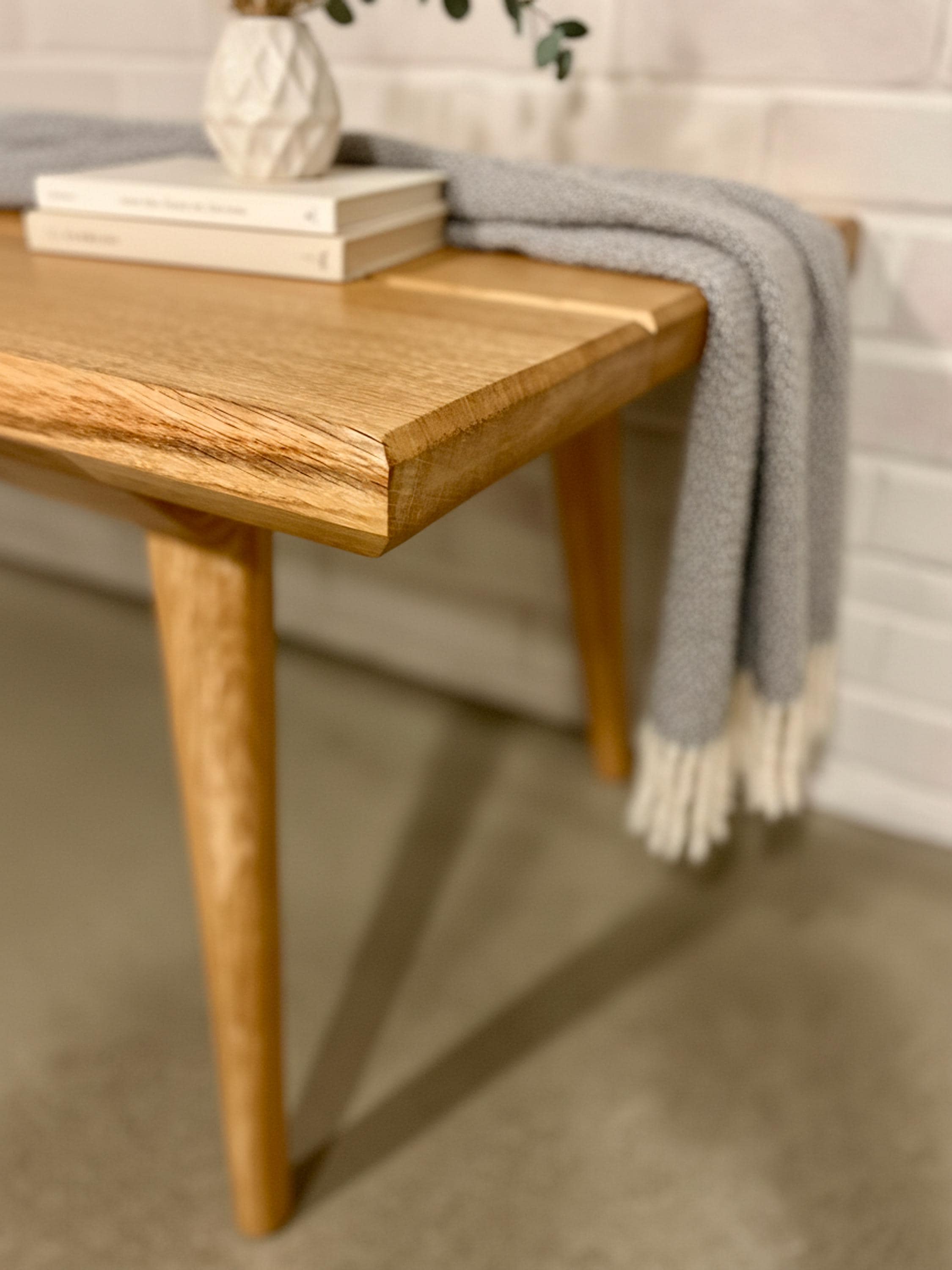 - Material: High-quality solid wood with natural grain - Design: Scandinavian style – simple, modern and timeless - Special feature: Integrated slot through which a blanket can be threaded, perfect to prevent it from slipping and keep it within easy reach. - Versatile use: Perfect as a bench, hallway bench, side table - Stable construction: Solid, slightly outward-sloping legs for maximum stability - Handmade: Each piece is unique